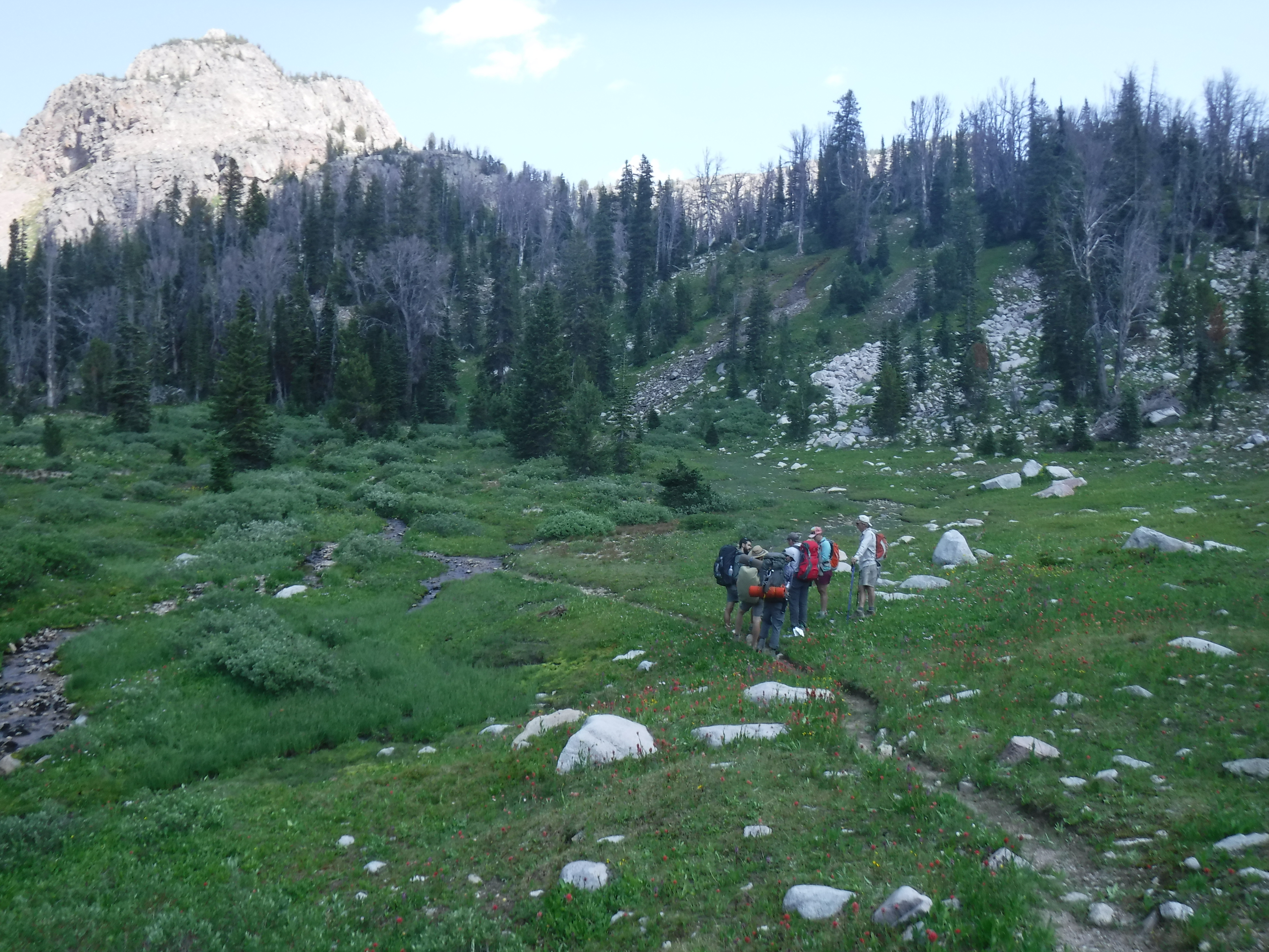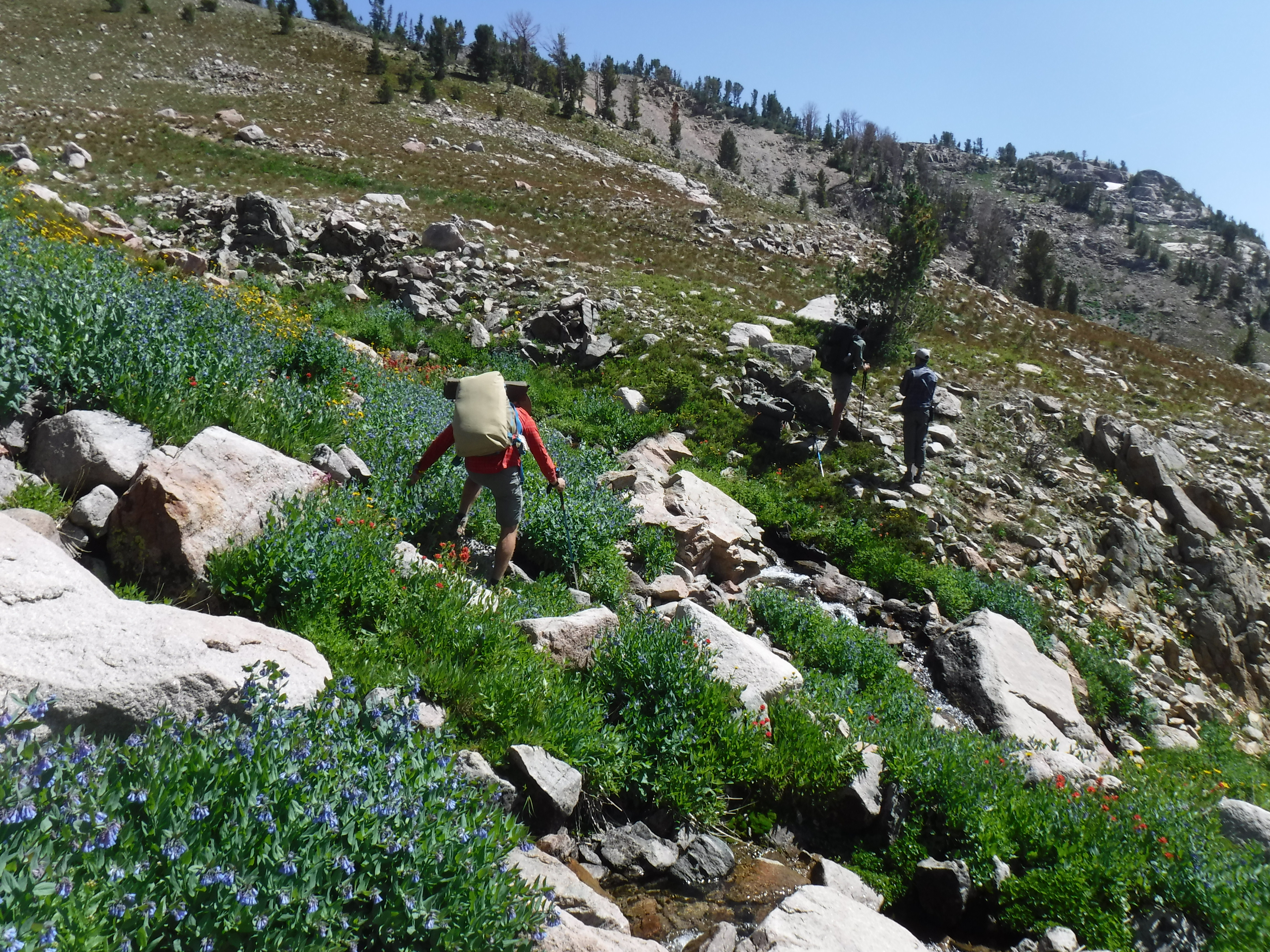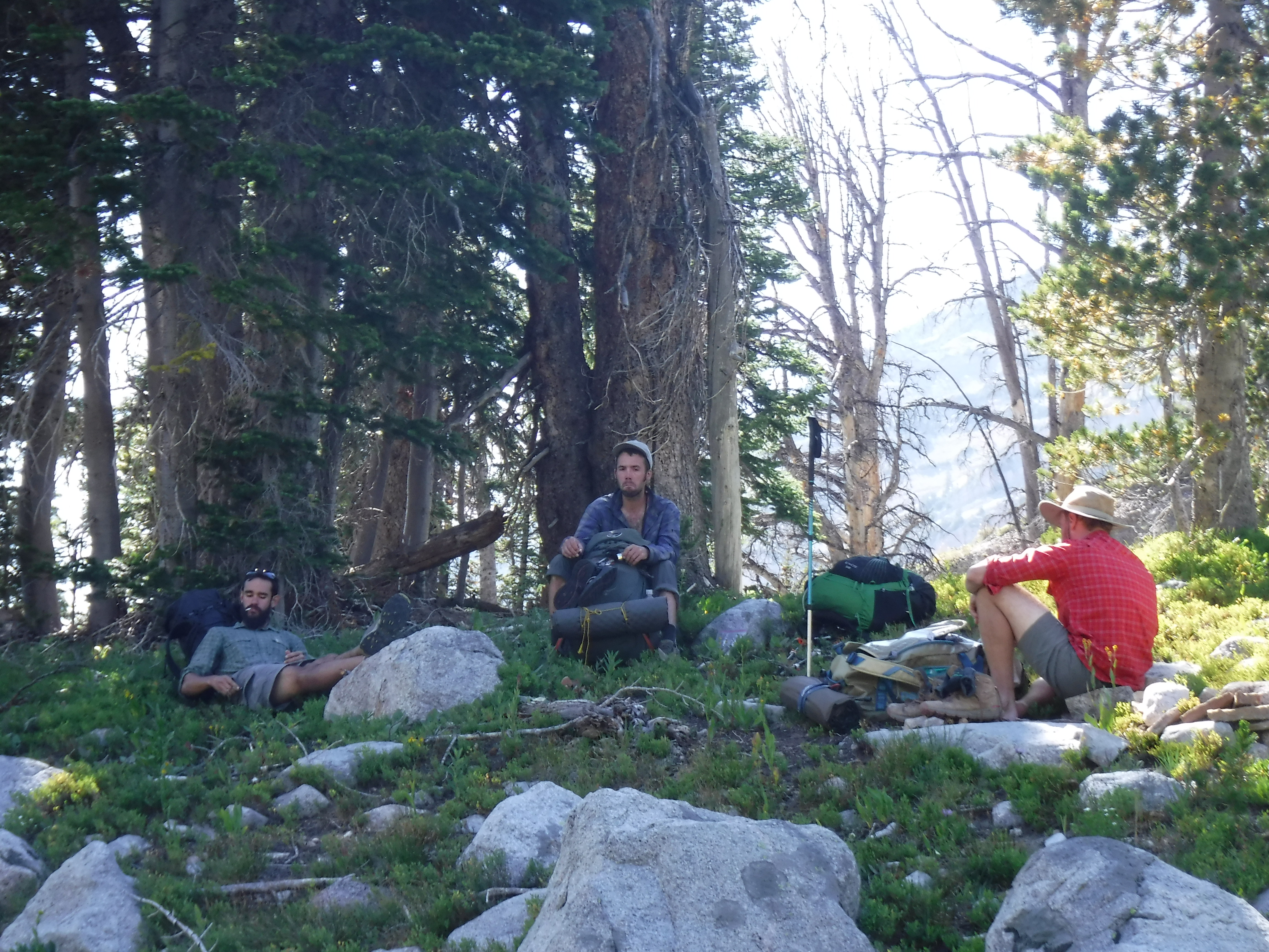 There was a point here, after crossing over dozens of boulders, stepping through streams, and always trekking at a slant against the mountain slope, where backpacks were slumped off and everyone laid sprawled out against the boulder-strewn landscape.